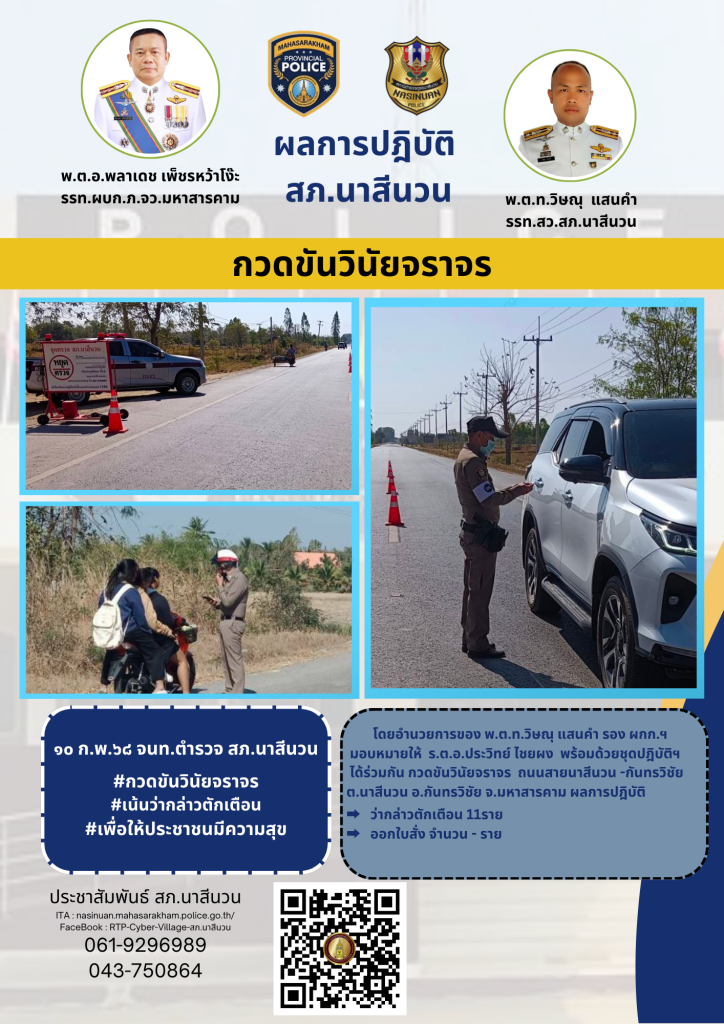 ๑๐ ก.พ.๖๘ จนท.ตำรวจ สภ.นาสีนวน โดยอำนวยการของ พ.ต.ท.วิษณุ แสนคำ รอง ผกก.ฯมอบหมายให้ ร.ต.อ.ประวิทย์ ไชยผง พร้อมด้วยชุดปฎิบัติฯได้ร่วมกัน กวดขันวินัยจราจร ถนนสายนาสีนวน -กันทรวิชัยต.นาสีนวน อ.กันทรวิชัย จ.มหาสารคาม ผลการปฎิบัติ