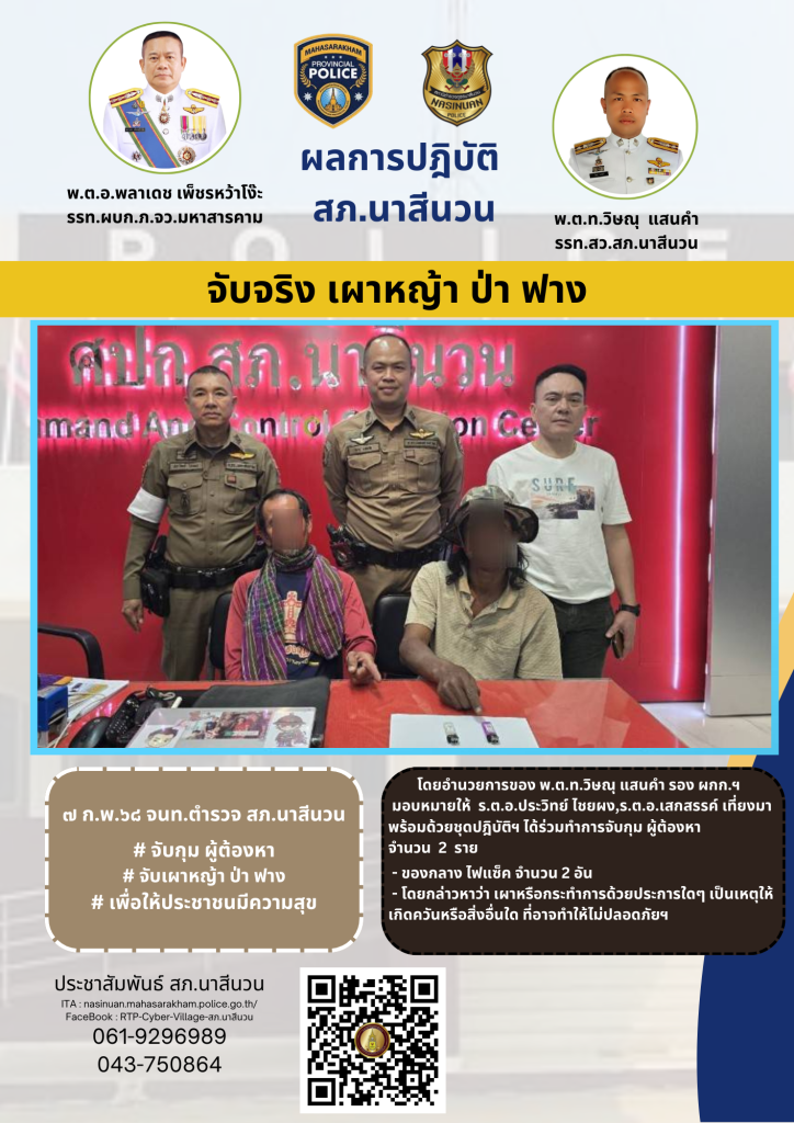 ๗ ก.พ.๖๘ จนท.ตำรวจ สภ.นาสีนวน โดยอำนวยการของ พ.ต.ท.วิษณุ แสนคำ รอง ผกก.ฯมอบหมายให้ ร.ต.อ.ประวิทย์ ไชยผง,ร.ต.อ.เสกสรรค์ เที่ยงมา พร้อมด้วยชุดปฎิบัติฯ ได้ร่วมทำการจับกุม ผู้ต้องหา จำนวน 2 ราย