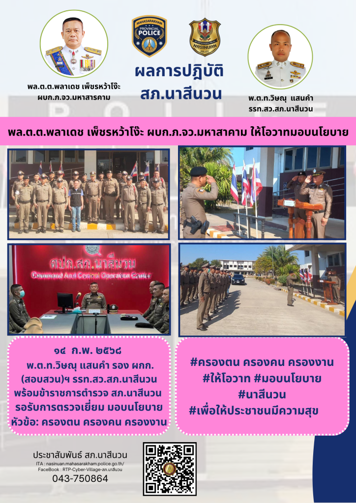 ๑๔ ก.พ. ๒๕๖๘ พ.ต.ท.วิษณุ แสนคำ รอง ผกก.(สอบสวน)ฯ รรท.สว.สภ.นาสีนวน พร้อมข้าราชการตำรวจ สภ.นาสีนวน รอรับการตรวจเยี่ยม มอบนโยบายหัวข้อ: ครองตน ครองคน ครองงาน