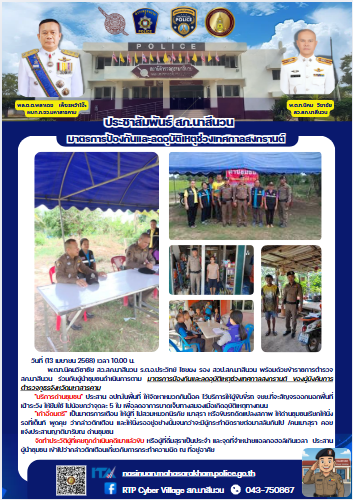 พ.ต.ท.นิคมวิชาชัย สว.สภ.นาสีนวน ร.ต.อ.ประวิทย์ ไชยผง รอง สวป.สภ.นาสีนวน พร้อมด้วยข้าราชการตำรวจสภ.นาสีนวน ร่วมกับผู้นำชุมชนดำเนินการตาม มาตรการป้องกันและลดอุบัติเหตุช่วงเทศกาลสงกรานต์ ของผู้บังคับการตำรวจภูธรจังหวัดมหาสารคาม