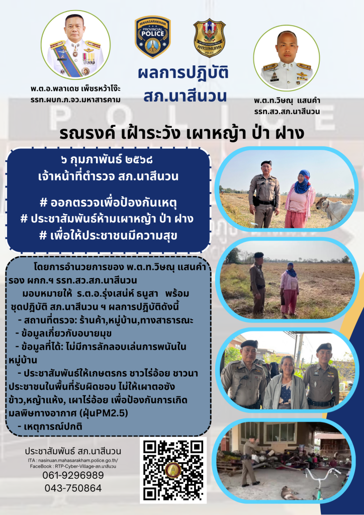 ๖ กุมภาพันธ์ ๒๕๖๘ เจ้าหน้าที่ตำรวจ สภ.นาสีนวน โดยการอำนวยการของ พ.ต.ท.วิษณุ แสนคำ รอง ผกก.ฯ รรท.สว.สภ.นาสีนวน มอบหมายให้ ร.ต.อ.รุ่งเสน่ห์ ธนูสา พร้อมชุดปฎิบัติ สภ.นาสีนวน ฯ ผลการปฎิบัติดังนี้