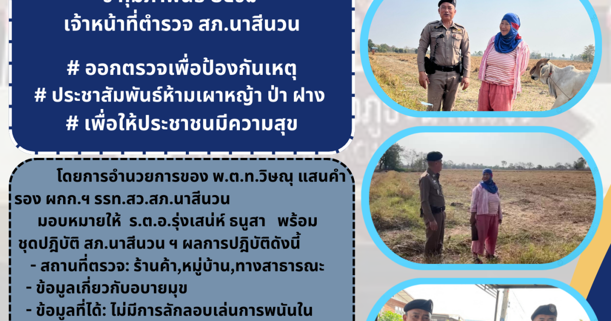 ๖ กุมภาพันธ์ ๒๕๖๘ เจ้าหน้าที่ตำรวจ สภ.นาสีนวน โดยการอำนวยการของ พ.ต.ท.วิษณุ แสนคำ รอง ผกก.ฯ รรท.สว.สภ.นาสีนวน มอบหมายให้ ร.ต.อ.รุ่งเสน่ห์ ธนูสา พร้อมชุดปฎิบัติ สภ.นาสีนวน ฯ ผลการปฎิบัติดังนี้