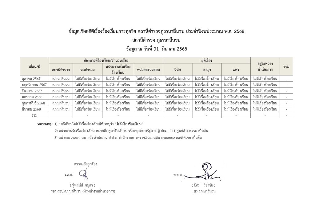 ข้อมูลเชิงสถิติเรื่องร้องเรียนการทุจริต สถานีตำรวจภูธรนาสีนวน ประจำปีงบประมาณ พ.ศ. 2568